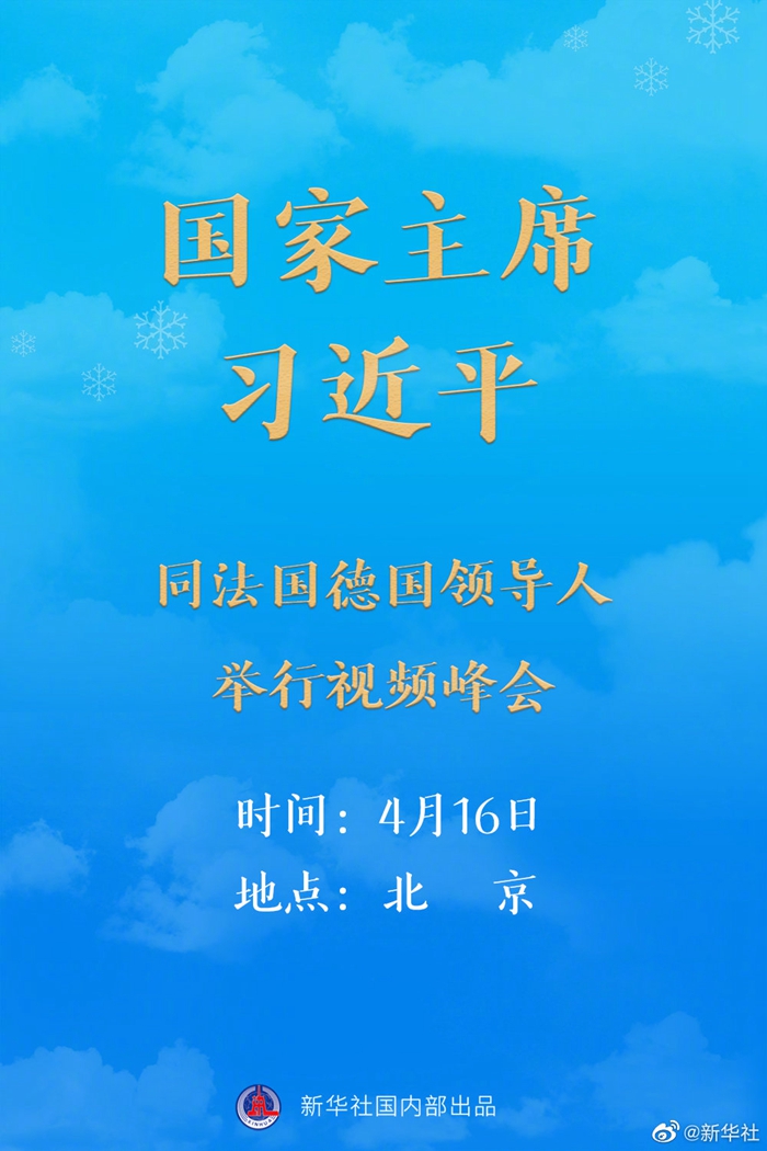 4月16日下午,国家主席习近平在北京同法国总统马克龙、德国总理默克尔举行中法德领导人视频峰会。三国领导人就合作应对气候变化、中欧关系、抗疫合作以及重大国际和地区问题深入交换意见。