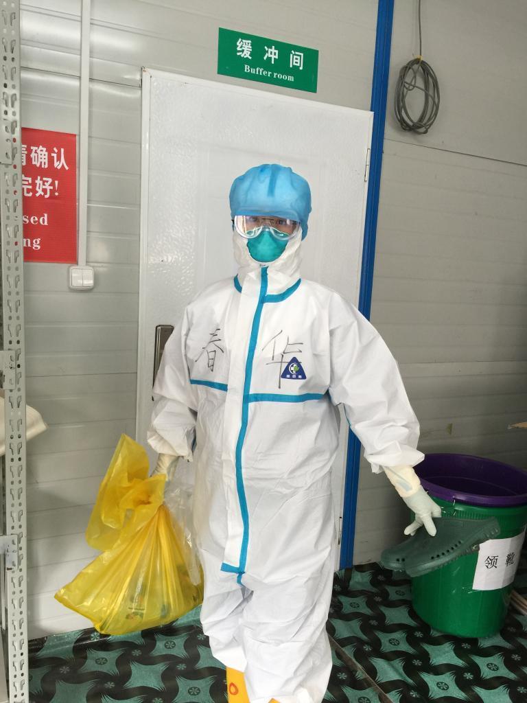 2015年2月12日,援非医疗队护士高春华在利比里亚病房外,准备为患者送食物。(图片由受访者提供)