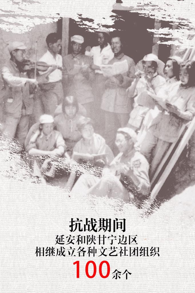 据不完全统计,自1936年11月至1942年5月,延安和陕甘宁边区相继成立各种文艺社团组织100多个,很多协会设在延安鲁艺,以鲁艺师生为骨干。延安艺术家们以艺术文学为武器,积极参加抗战动员,反对投降卖国,为民众觉醒和民族解放而呐喊高呼。
