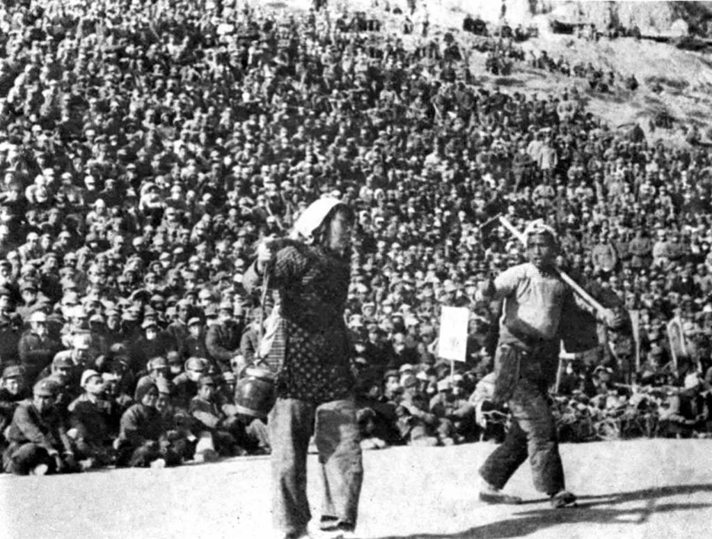 1943年2月,延安举行盛大的秧歌演出活动。图为鲁迅艺术学院演出秧歌剧《兄妹开荒》。(新华社资料照片)