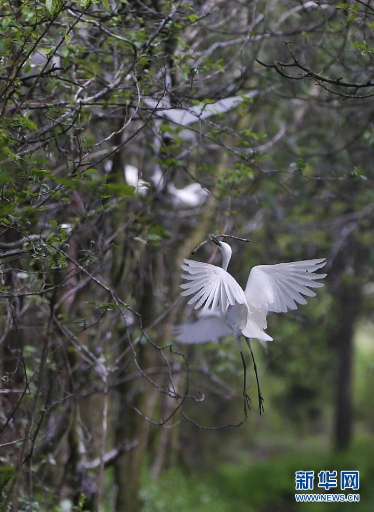 4月16日,在江苏泗洪洪泽湖湿地国家级自然保护区,鹭鸟在叼枝筑巢。