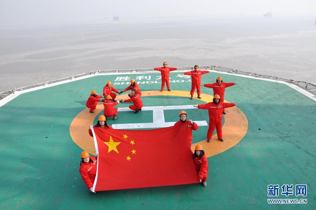 2013年2月9日,胜利油田海洋钻井平台上坚守一线的职工祝福祖国。新华社发(李新刚 摄)