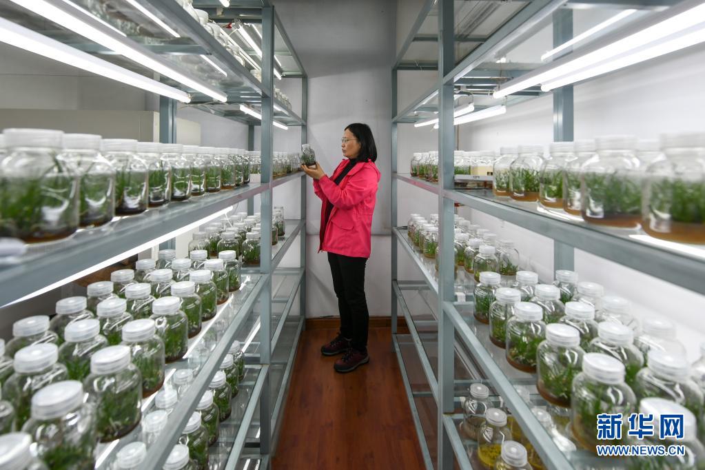 在乐山市峨眉山生物资源实验站,谷海燕在组培室观察人工繁育的峨眉槽舌兰幼苗的生长情况(4月14日摄)。新华社记者 唐文豪 摄