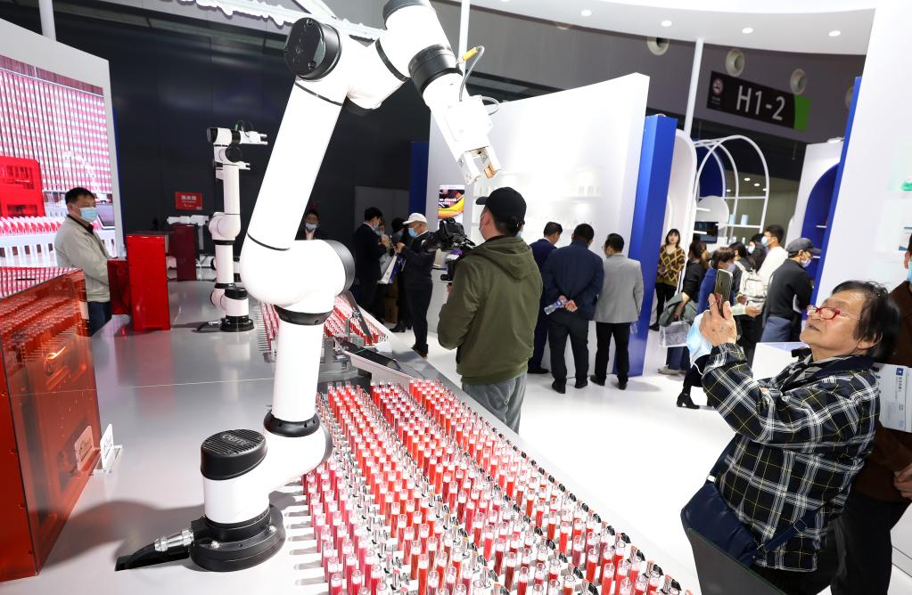 4月15日,第八届中国(上海)国际技术进出口交易会在沪开幕,参观者从一组农业机器人展品旁走过。新华社记者方喆 摄