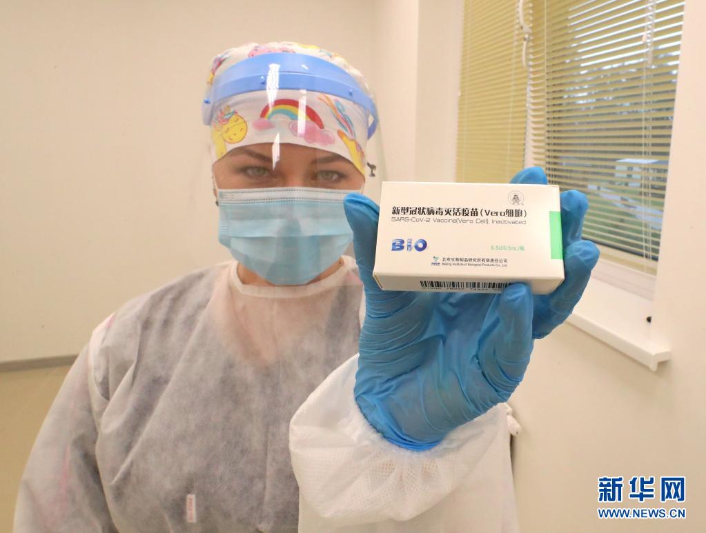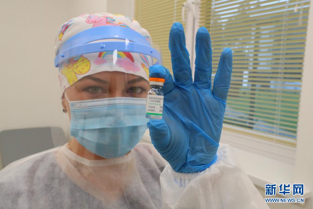 4月16日,在白俄罗斯首都明斯克郊区的中白工业园,医务人员展示中国国药集团研制和生产的新冠灭活疫苗。新华社发(任科夫摄)
