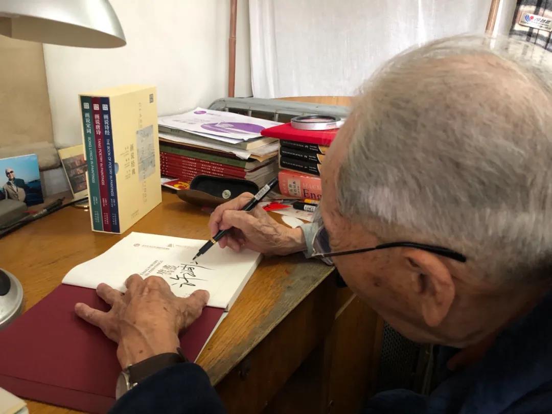 家里占据两面墙的书架上,他自己的书几乎都要放不下了,逐渐占领了墙角、沙发、地板……一同前往的中译出版社编辑,带去他刚出版的新书——《西南联大求学日记》《画说经典》《古诗里的核心词》以及“许渊冲英译中国传统文化经典系列”21种等,摆了满满一桌。