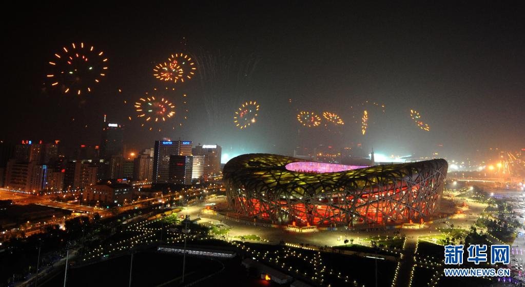 2008年8月8日晚,在“鸟巢”举行的北京奥运会开幕式上的焰火表演“欢庆笑脸”。(新华社记者杨磊摄)