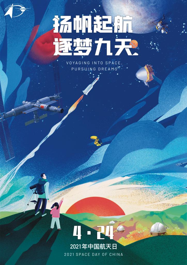 经过评审,由来自兰州大学艺术学院的王淑君同学设计的海报被选定为2021年“中国航天日”宣传海报,该作品紧扣“扬帆起航 逐梦九天”的主题,色彩和谐,富有想象力。画面中,在南京紫金山天文台的衬托下,一位父亲带着女儿遥望星空,讲述着嫦娥五号、天问一号和中国空间站的壮举,勾勒出一幅温馨而美好的画面,寓意着不断发展的事业,不懈追求的航天梦。宣传海报可从“中国的航天”微信公众号、国家航天局网站下载。