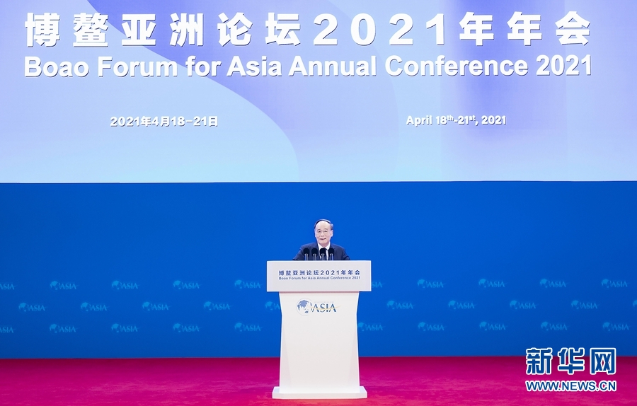 4月20日,国家副主席王岐山在海南博鳌出席博鳌亚洲论坛2021年年会开幕式,集体会见论坛理事和战略合作伙伴,并同中外企业家代表座谈。新华社记者 李涛 摄