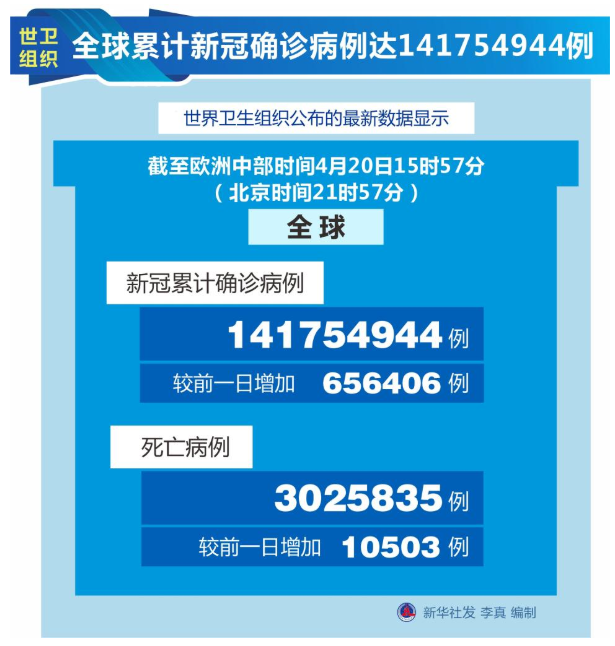 世卫组织网站最新数据显示,截至欧洲中部时间20日15时57分(北京时间21时57分),全球确诊病例较前一日增加656406例,达到141754944例;死亡病例增加10503例,达到3025835例。