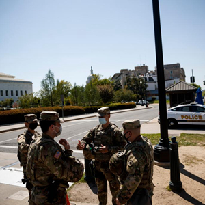 4月20日,在美国首都华盛顿,国民警卫队成员和警察在国会附近警戒。