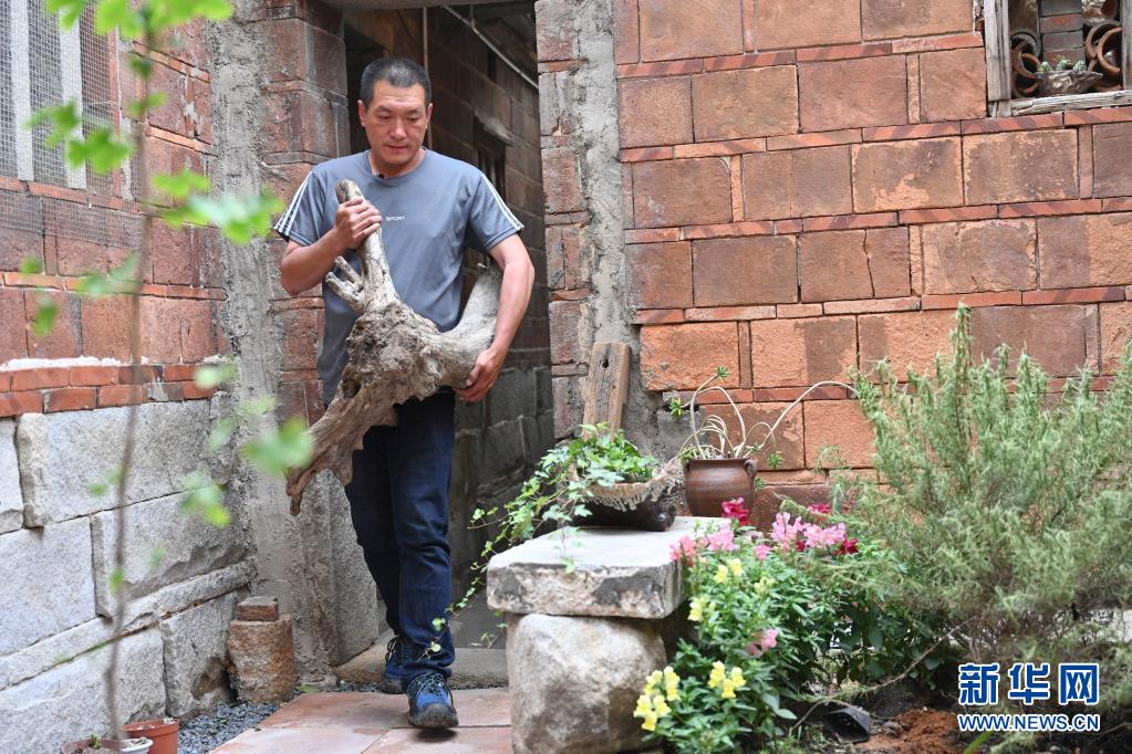 4月19日,蔡竞翔在被改造为海漂艺术品陈列馆的老宅里搬运一块海滩捡来的树根。