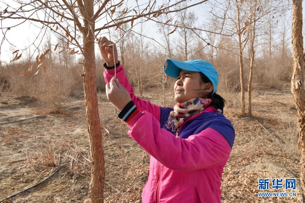 治沙员帕提古丽观察梭梭林长势(4月1日摄)。新华社记者 高晗 摄