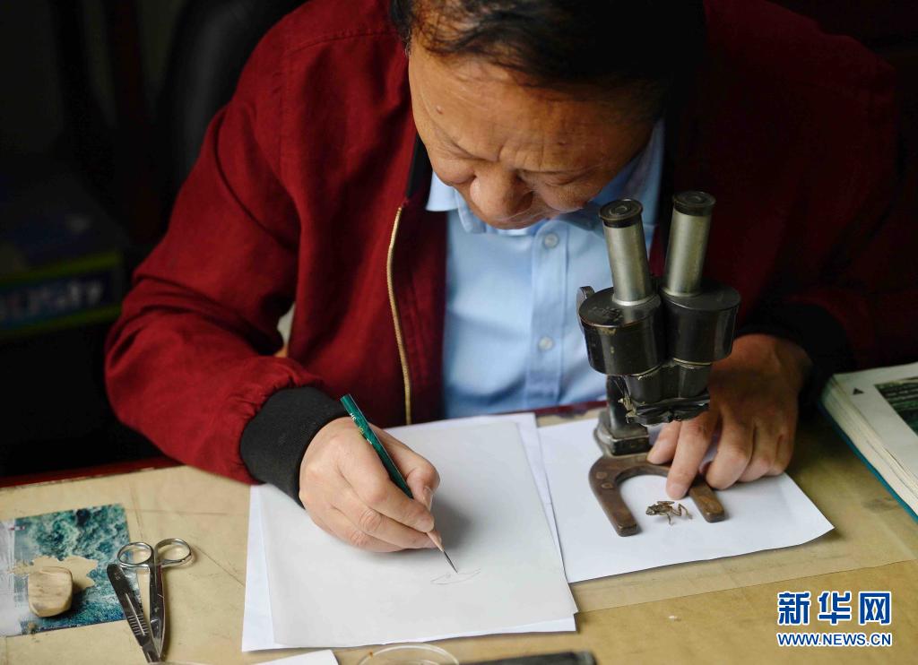 4月13日,李健在办公室一边用显微镜观察标本一边绘图。新华社记者 刘坤 摄