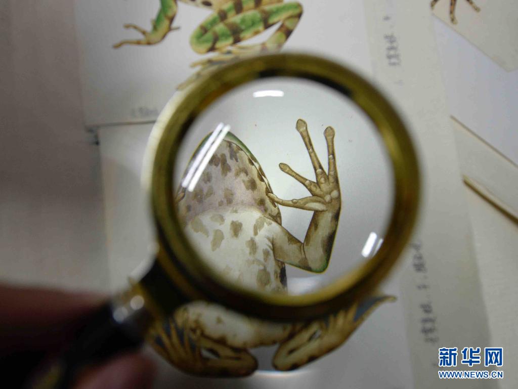 李健在办公室用放大镜展示他手绘作品的细节(4月14日摄)。新华社记者 刘坤 摄