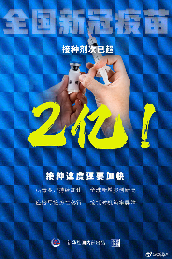 21日国务院联防联控机制新闻发布会上,国家卫健委新闻发言人米锋介绍,截至目前,我国新冠疫苗接种超2亿剂次。全球疫情仍处于高水平流行期,全球新增确诊病例数已连续8周上升,其中上周新增526万例,为疫情发生以来单周最高,病毒继续出现新的变种,外防输入、内防反弹任务艰巨,务必加快推进新冠疫苗接种,应接尽接。(记者王琳琳、陈席元,海报设计:张晨光)