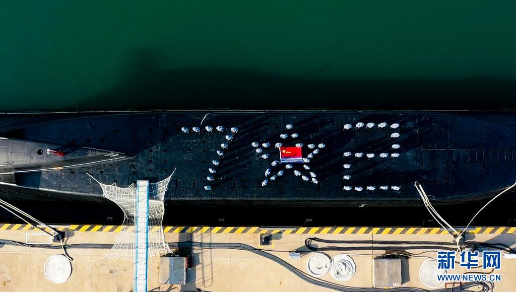 海军某潜艇基地官兵在潜艇上摆出“72”和五角星图案,庆祝人民海军成立72周年(资料照片)。 新华社发(金昊 摄)