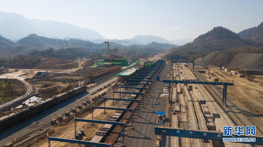 这是2020年12月29日在老挝琅勃拉邦拍摄的中老铁路琅勃拉邦车站铺轨现场(航拍照片)。新华社发(老中铁路有限公司供图)