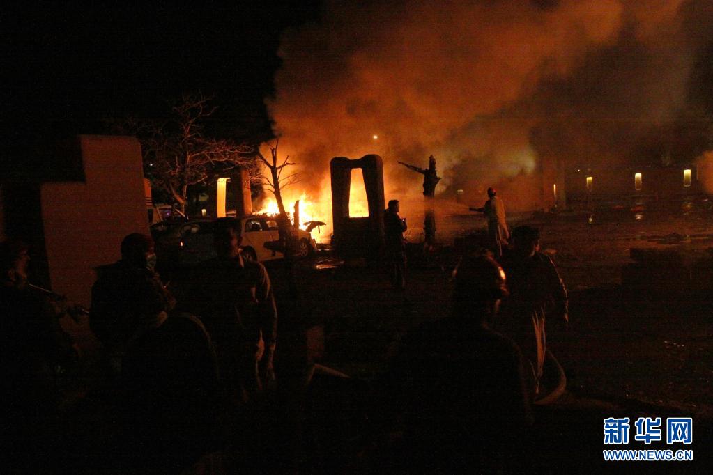 4月21日,在巴基斯坦西南部俾路支省首府奎达市,爆炸发生后现场燃起大火。新华社发(阿萨德摄)