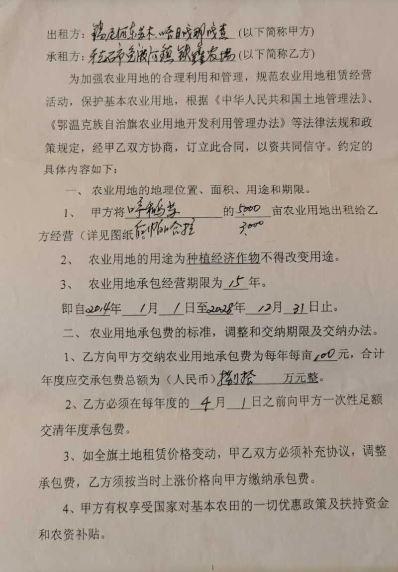 鄂温克旗一些种植户手里的农业用地租赁合同已签至2028年