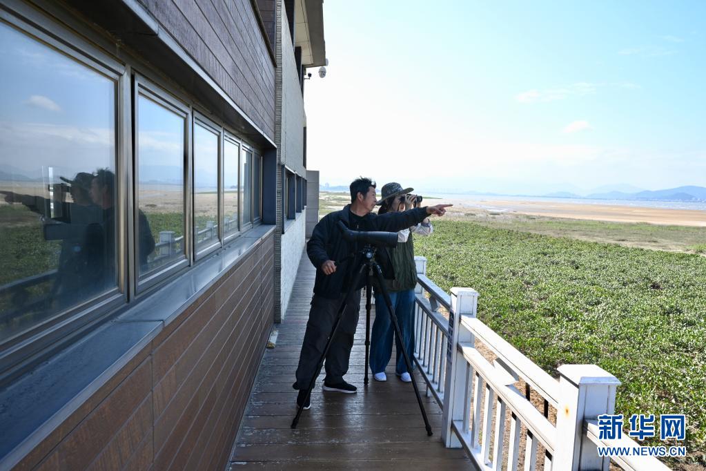 4月20日,在闽江河口湿地国家级自然保护区,观鸟者用望远镜观看湿地鸟类。