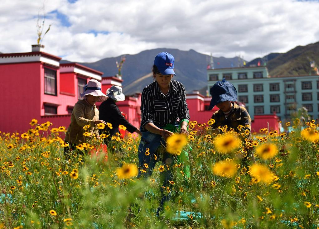 西藏拉萨市曲水县四季吉祥村村民在采摘雪菊(2017年9月27日摄)。新华社记者 晋美多吉 摄