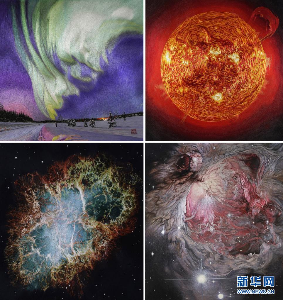 这是陈英华“星空系列”的部分苏绣作品(拼版照片)。新华社发