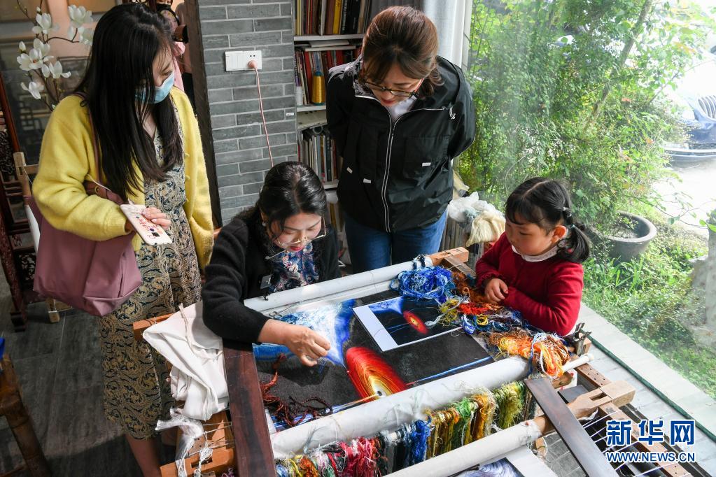 在位于苏州高新区镇湖街道的苏绣工作室内,陈英华(右三)为前来参观的客人展示苏绣技法(4月14日摄)。新华社记者 李博 摄