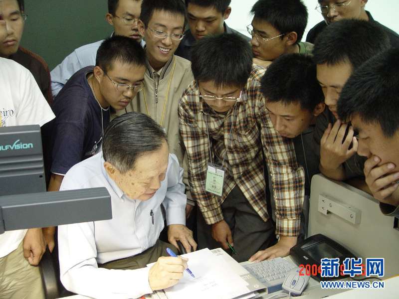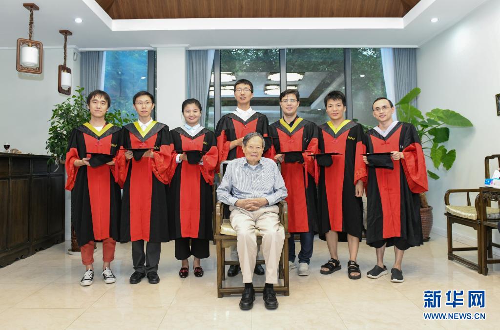 杨振宁先生与博士生在清华大学合影。(新华社发)