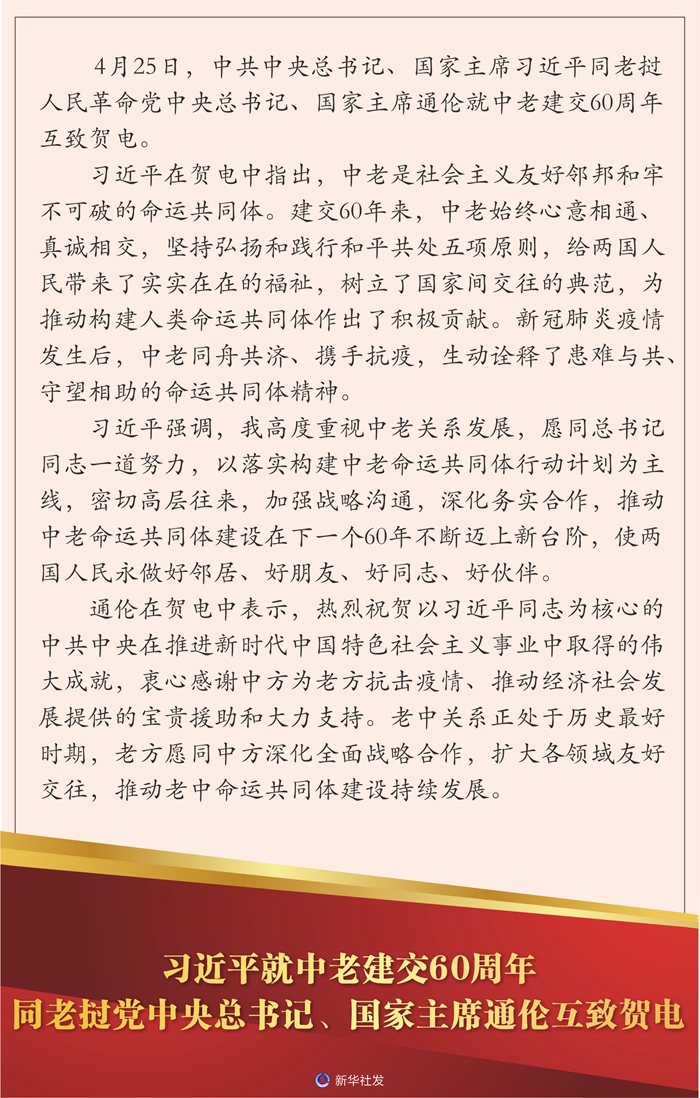 新华社北京4月25日电 4月25日,中共中央总书记、国家主席习近平同老挝人民革命党中央总书记、国家主席通伦就中老建交60周年互致贺电。