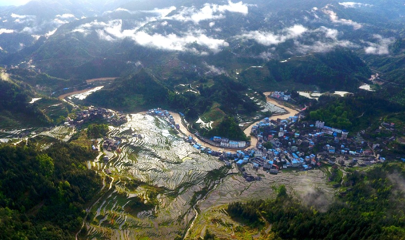 广西融水苗族自治县杆洞乡杆洞村梯田(2019年4月16日摄,无人机照片)。