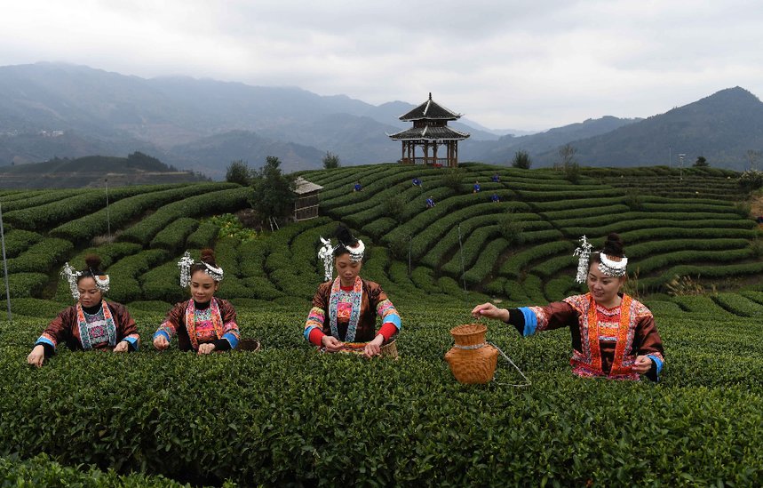 在广西三江侗族自治县八江镇布央村,几名女子在采茶(2017年2月23日摄)。