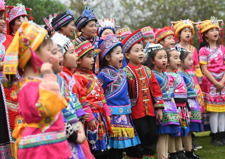 在广西河池市罗城仫佬族自治县成龙湖广场,小朋友唱山歌欢庆“三月三”(2021年4月14日摄)。