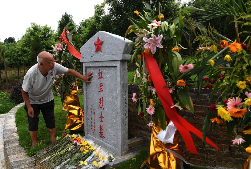 在广西桂林米花山红军烈士墓,蒋石林抚摸烈士墓碑(2019年6月29日摄)。蒋石林一家祖孙五代,为湘江战役中牺牲的红军烈士守墓。