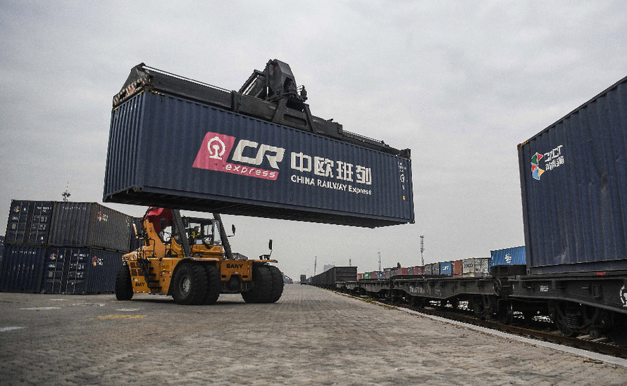 在广西钦州港东站,吊车在装运中欧班列货物(2021年1月16日摄)。