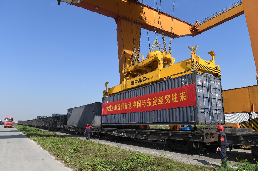 工人在广西南宁国际铁路港吊装集装箱(2020年11月11日摄)。