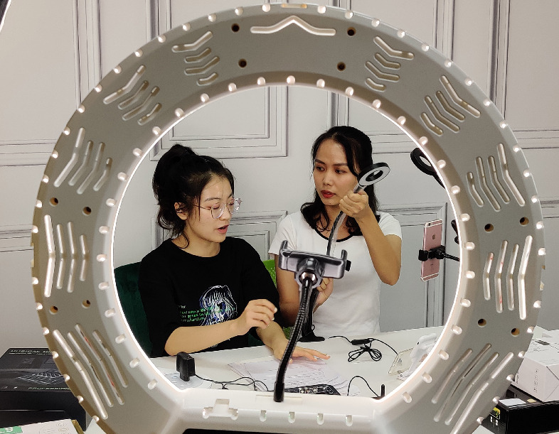 广西外国语学院越南留学生邓氏仙(右)在广西自贸试验区南宁片区一家跨境电商企业直播人才孵化基地内进行直播(2020年8月25日摄)。