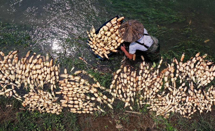 在广西柳州市柳江区进德镇龙新村屯六屯,村民在水渠里清洗莲藕(2020年7月3日摄,无人机照片)。龙新村围绕产业扶贫和现代农业,大力发展莲藕、葡萄、火龙果等特色产业,助力农民致富。
