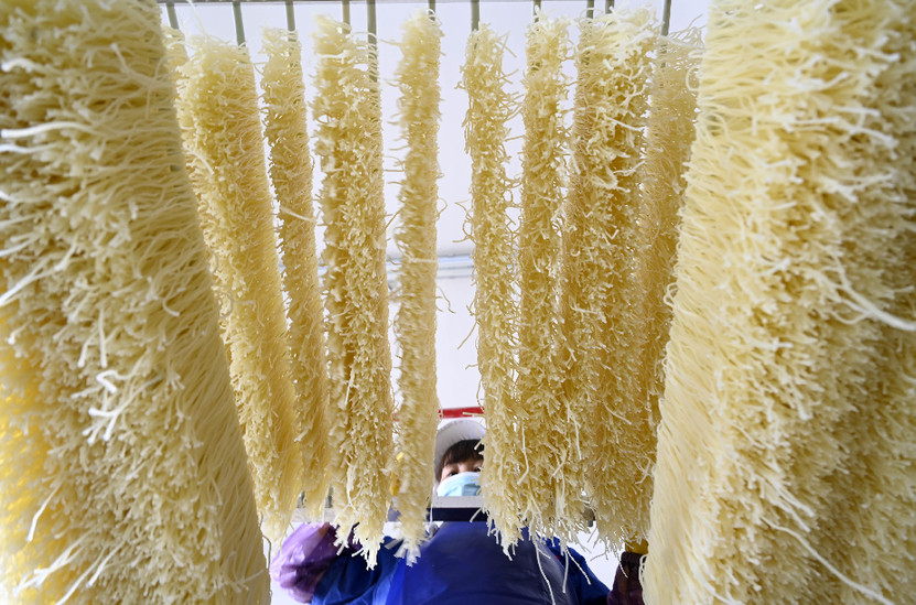 在广西柳州螺蛳粉产业园一家螺蛳粉企业,工人在米粉车间里忙碌(2020年12月18日摄)。