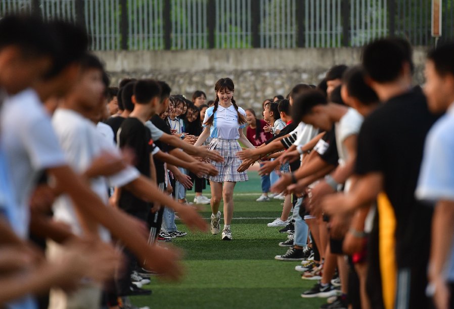 在广西融水苗族自治县思源实验学校举办的支教团送别晚会上,支教老师高洁(中)接受同学们的祝福(2020年7月22日摄)。