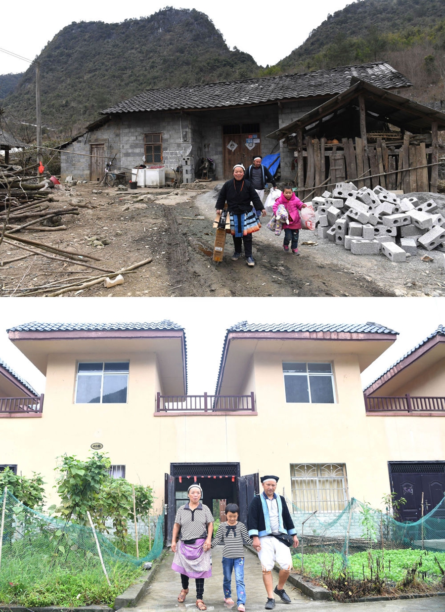 这是一张拼版照片。上图:黎治明(后)一家从广西南丹县八圩瑶族乡吧哈村的家里出来,准备搬往新家(2018年2月4日摄)。下图:在广西南丹县“千家瑶寨·万户瑶乡”八圩瑶寨易地扶贫搬迁安置点,村民黎治明(右)一家走出家门(2020年8月6日摄)。