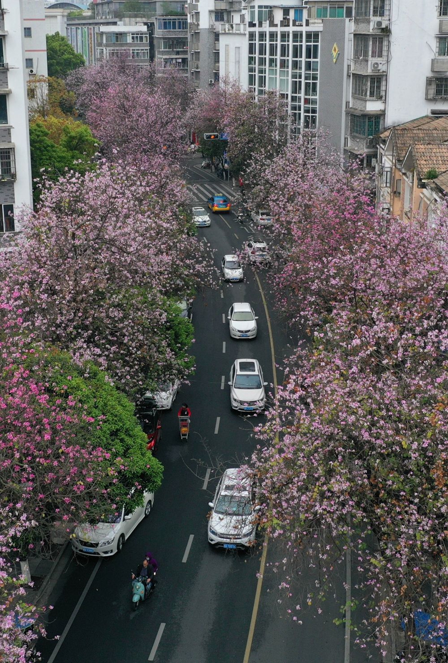 汽车在洋紫荆盛开的广西柳州市弯塘路上行驶(2021年2月28日摄,无人机照片)。曾经的“酸雨之都”柳州如今变身紫荆花城。
