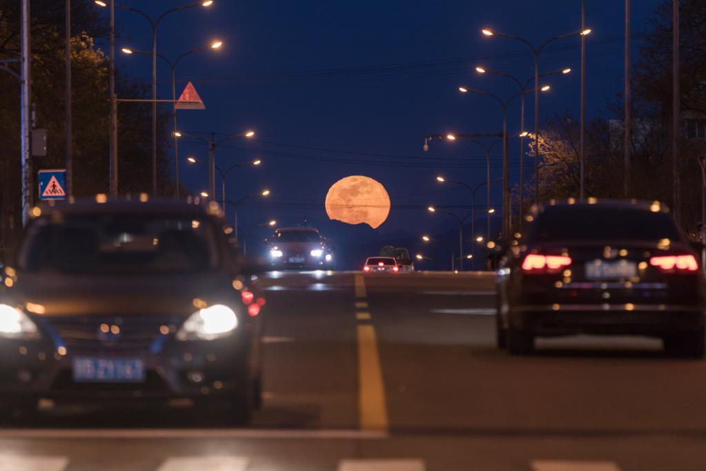 北京市天文爱好者王俊峰2020年4月8日在北京拍摄的“超级月亮”照片。(王俊峰供图)