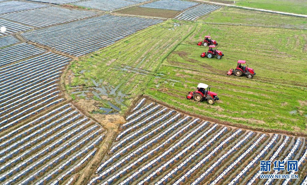 3月3日,在江西省兴国县高兴镇新圩村高标准农田里,农户驾驶“铁牛”翻耕农田。新华社发(张声 摄)