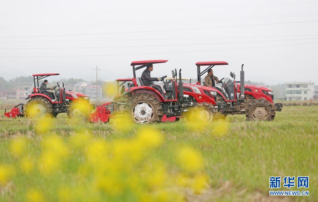 春耕时节,在江西省南昌县塘南镇,旋耕机、插秧机、无人机等各种农用机械,在农机手熟练操作下,正在进行精细化作业,展现了一幅现代农耕图。