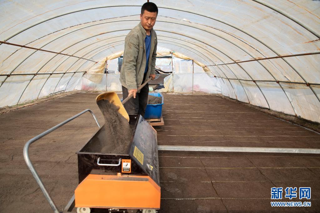 4月20日,在黑龙江省大庆市林甸县东兴乡勤俭村,农民许洪阳在进行水稻育秧。新华社记者 张涛 摄
