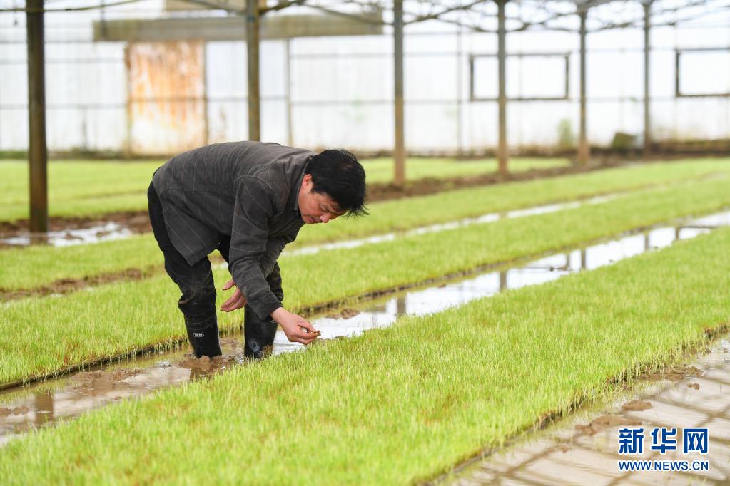 4月12日,在湖南省益阳市赫山区欧江岔镇牌口村,刘进良在育秧棚里查看秧苗生长情况。新华社记者 陈泽国 摄