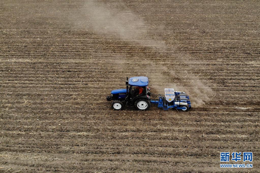 4月13日,在河北省秦皇岛市昌黎县,种植户操作播种机播种玉米等大田作物。新华社发(昌黎县融媒体中心供图)