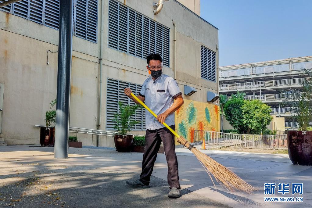 4月26日,一名戴口罩的男子在菲律宾马尼拉一处商场打扫。新华社发(乌马利摄)