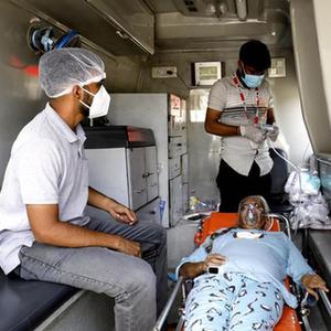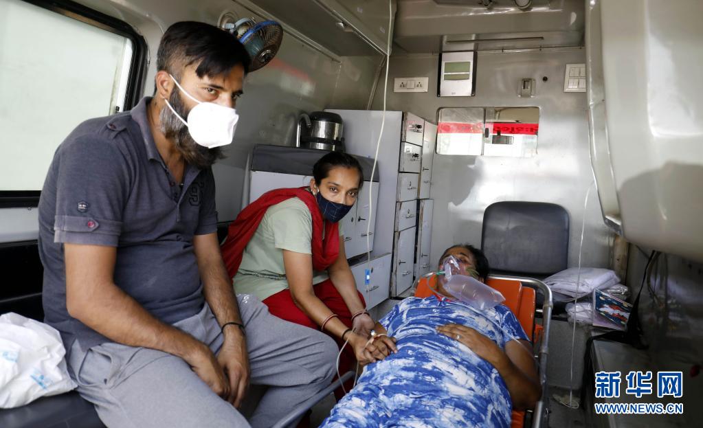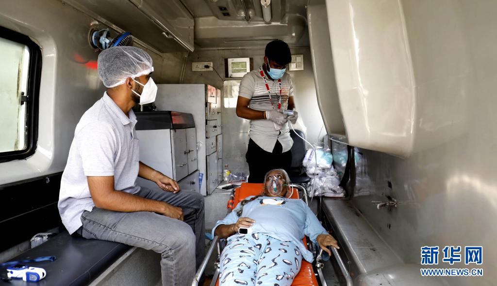 4月26日,一名新冠患者在印度艾哈迈达巴德的一辆救护车上接受治疗。新华社发
